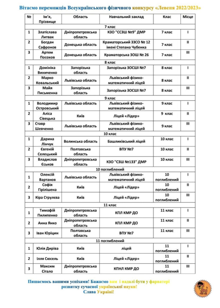 Шановні вчителі-координатори, оргкомітет ВФК «Левеня» щиро вдячний Вам за підготовку учнів і активну участь у Всеукраїнському фізичному конкурсі «Левеня – 2022/2023», за підсумками якого було нагороджено 21 учня по всіх паралелях, які показали найкращі результати.